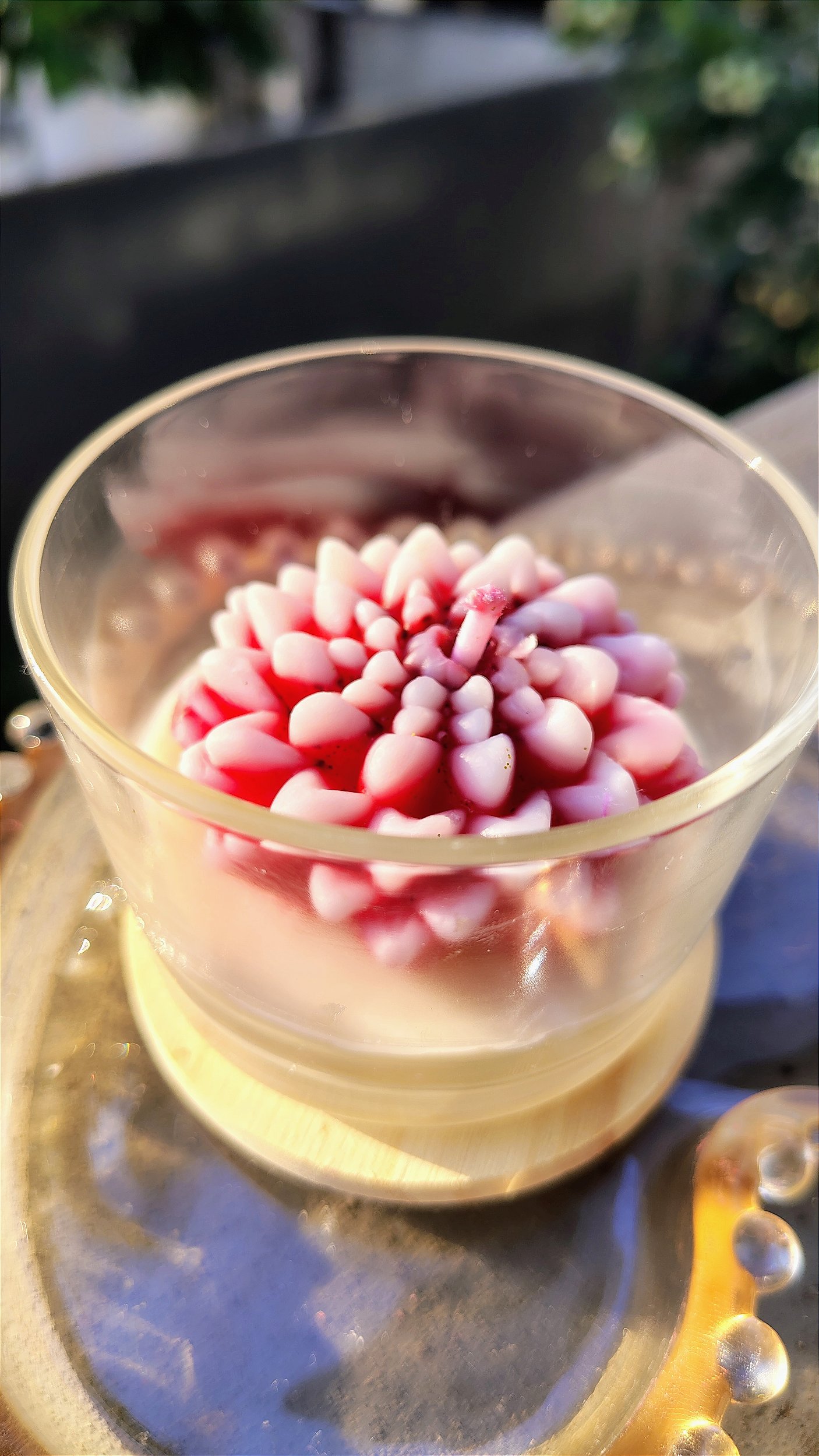 Vela no pote de vidro 150ml com flor de Lótus , feita com cera de coco e de palma.